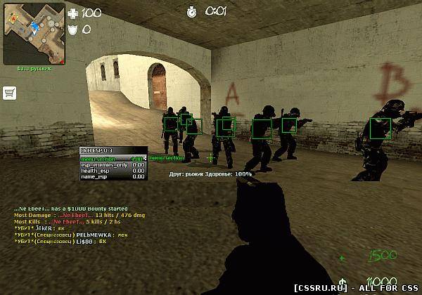 Расскажу немного о чите, данный файл я ни хотел выкладывать так как это считался моим любимым скриптом и самым лучшим тогда и даже сегодня, он подходит для версии cs source v34, как известно не палится античитами VAC, VAC2, detox. Сам чит представляет из себя очень большое меню которое позволит вам выбрать разные настройки вх, например: писать сколько жизней у противника или нет, точка или квадратик. Как известно основные функции чита это