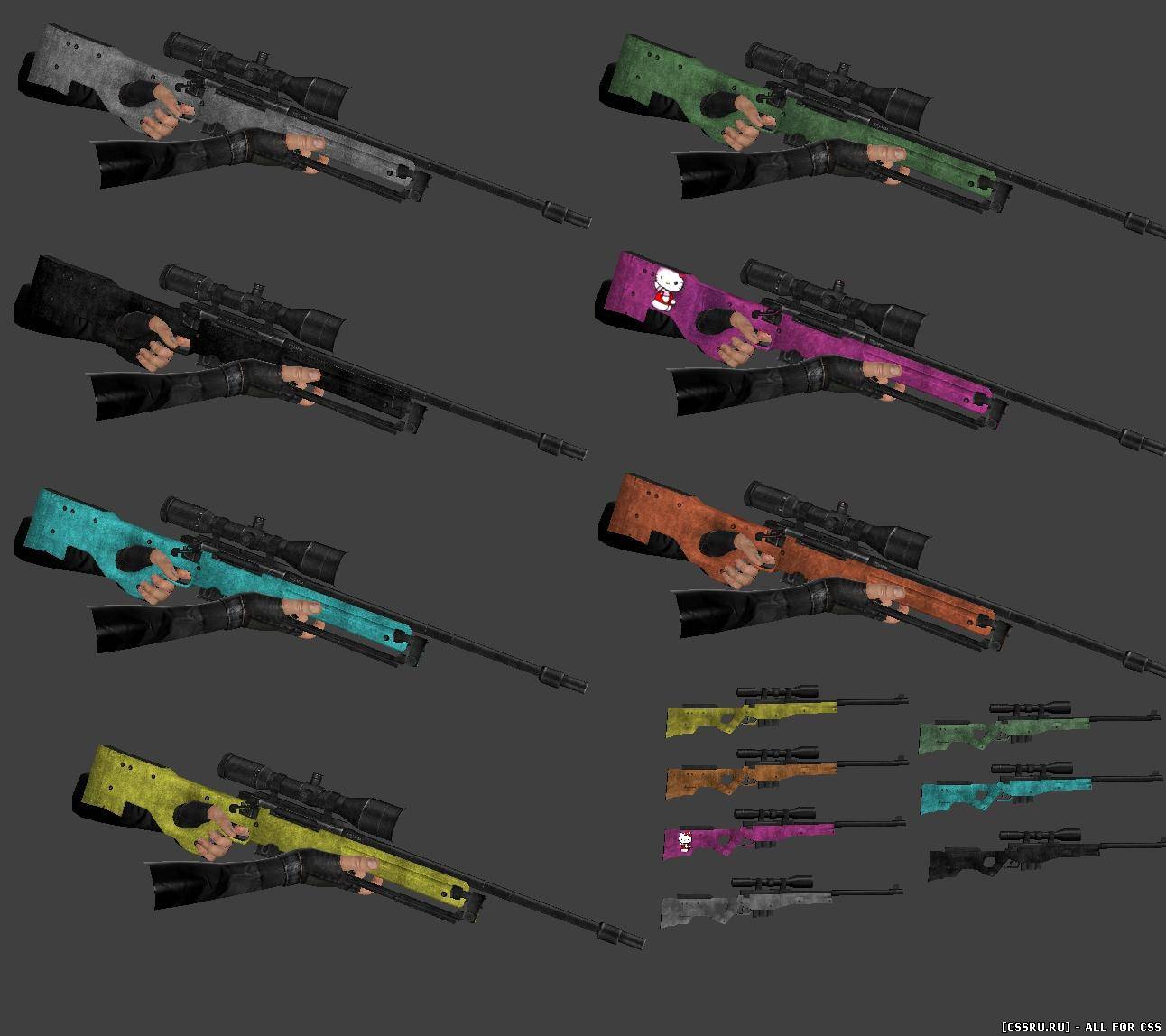 Большой пак шкурок AWP - В архиве очень много видов авп. А точнее awp (Слон) одинаковые проста были сделано много цветов, ведь у всех разный вкус. И они могу подобрать себе нужные цвет. Данный пак awp довольно хороший, тем что было изменено текстура, на более красивее. И цвета автор данных модель, проста нужные подобрал. Они светлые, но приятные глазам, я люблю лично яркие и многие другие я думаю. Главное то что нету в архиве вирусов, и можете не боятся что будет другая стрельба. Так как модель только изменена внешне, а так физика такая же. Если вы не умеете устанавливать модели читайте инструкцию ниже и вы всё поймёте.