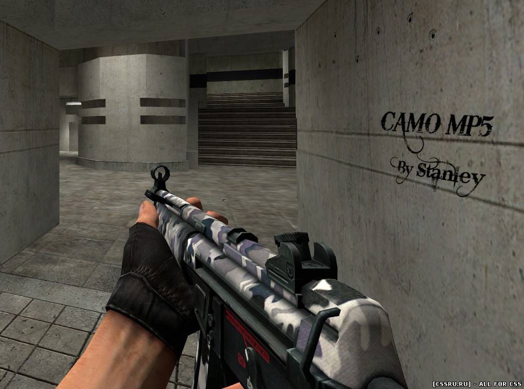 Это обычная модель Mp5, с стандартными звуковыми эффектами и анимацией, изменены только обычные  черные  текстуры  на красивый серый камуфляж. Который по моему мнению лучше идет для этого девайса.