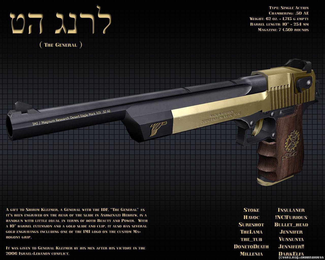 Одна из лучших моделей , которая заменяет именно модель Deagle Eagle , так же в данной модели изменена анимация и звуки , так же есть 3 окраски , Это : Золотой цвет , Серебряный цвет , и Черный цвет. Так же в архиве есть и стандартная модель Deagle , что бы вы могли заменить ее , если вам не понравиться Револьер для css